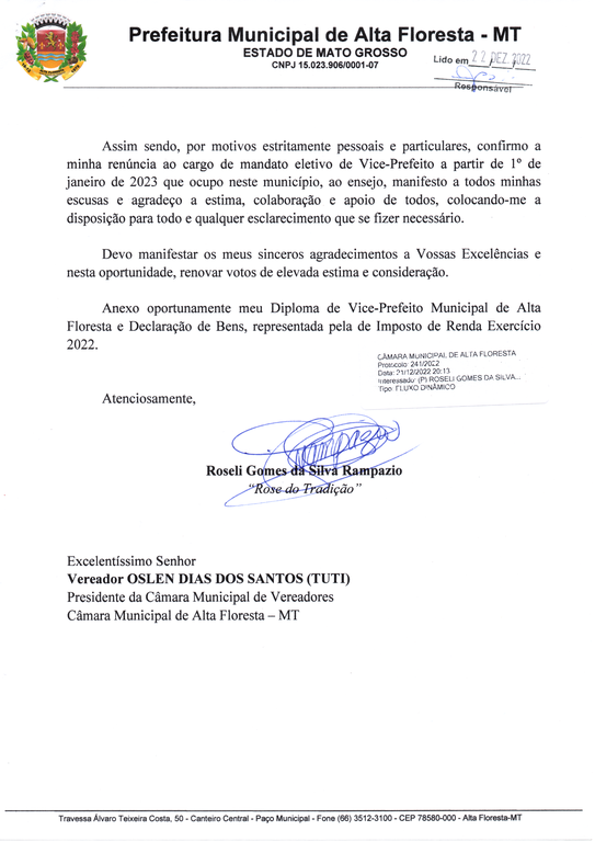 A Câmara Municipal de Vereadores de Alta Floresta, Estado de Mato Grosso, cumprindo com disposições regimentais, seguindo a Carta de Renúncia protocolada no dia 21 de dezembro de 2022, através do Ofício nº 015/2022, de 20 de dezembro de 2022, pela vice-prefeita Roseli Gomes da Silva Rampazio, torna público a leitura da renúncia em Sessão Extraordinária no dia 22 de dezembro de 2022, conforme documento anexo.