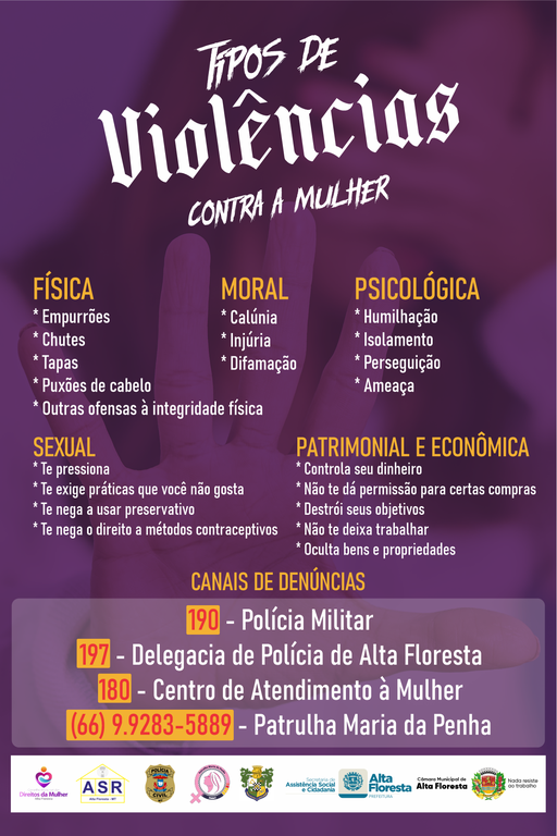 A Semana Municipal pela Não Violência Contra a Mulher conta com o apoio da Prefeitura de Alta Floresta, através da Secretaria Municipal de Assistência Social e Cidadania, Câmara de Vereadores, Polícia Militar e Patrulha Maria da Penha, Polícia Judiciária Civil e Casa da Amizade.