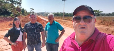 A vereadora Leonice Klaus dos Santos e os vereadores Tuti, presidente da Câmara Municipal de Alta Floresta, Francisco Ailton dos Santos e Reginaldo Luiz da Silva, o Naldo da Pista, visitaram a obra neste fim de semana para acompanhar o andamento dos trabalhos de preparação da terraplanagem e da base.